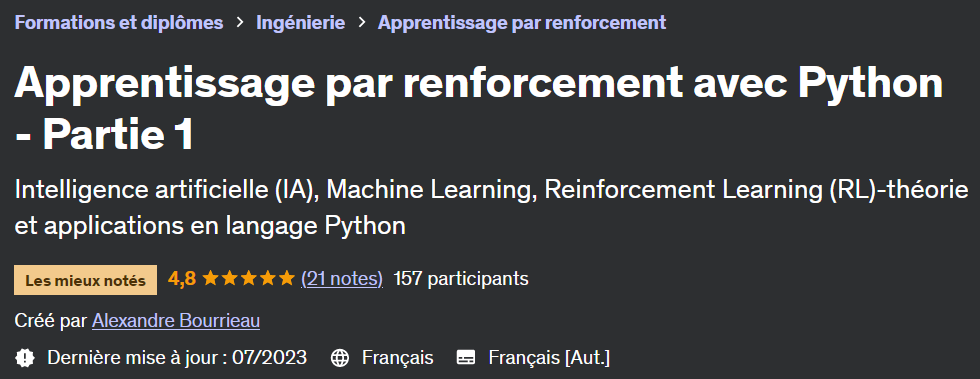Les activités en Python sont clairement expliquées. D'une durée totale de 9h, ce cours vous permettra de comprendre et de mettre en application les algorithmes d’apprentissage par renforcement.